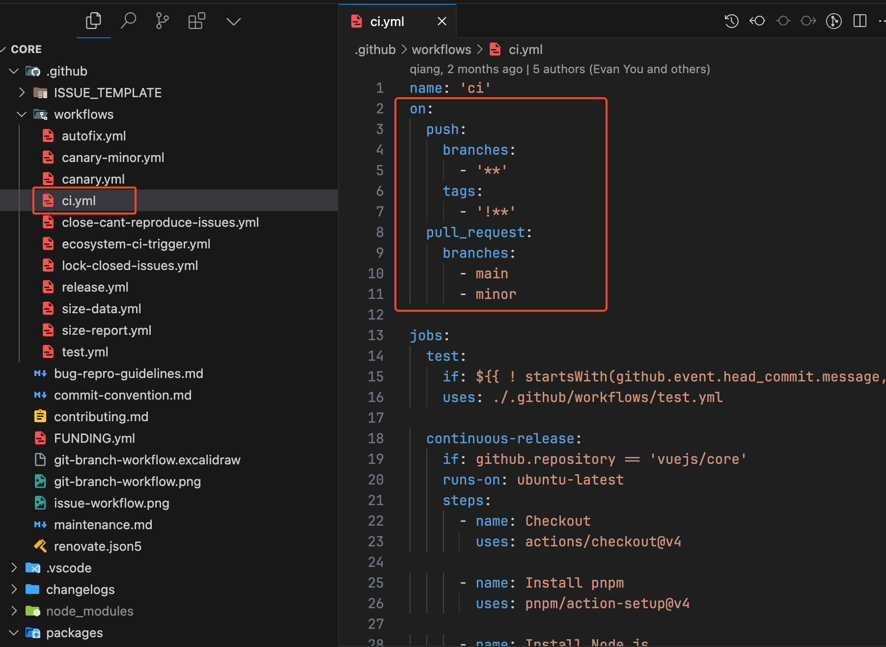 这个ci.yml定义了一个名为ci的工作流,触发条件就是上面的on字段定义的内容:当代码push到Vue仓库中的任何一个分支,或者是发起一个到main 或 minor 分支的 Pull request 时。