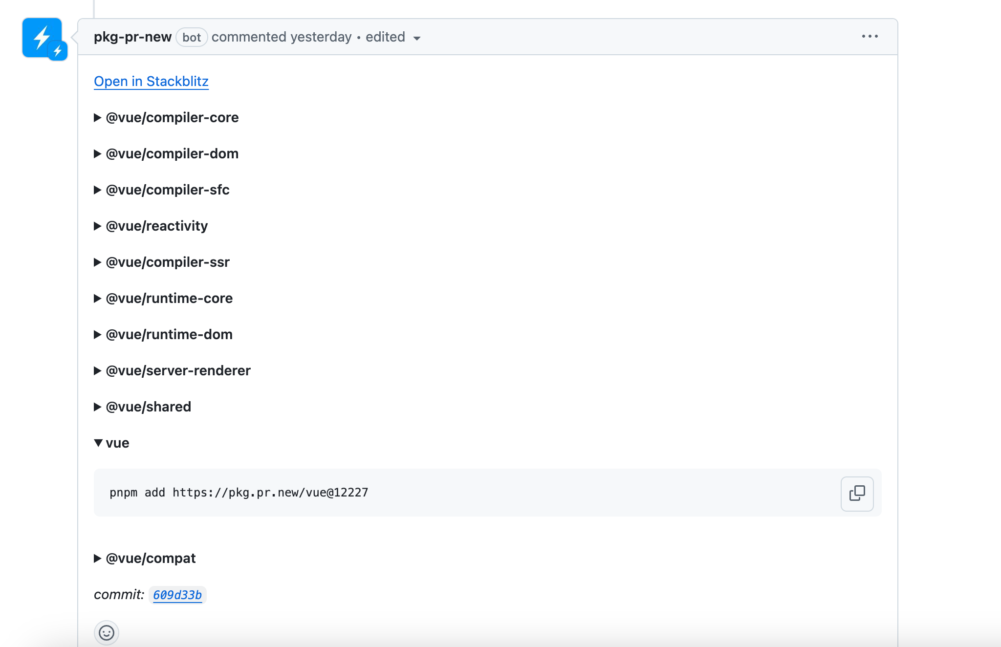 然后在这个PR中可以看到一个名为pkg-pr-new的机器人发布的评论,如下图: