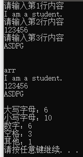 printf("大写字母:%d\n小写字母:%d\n数字:%d\n空格:%d\n其他:%d\n",