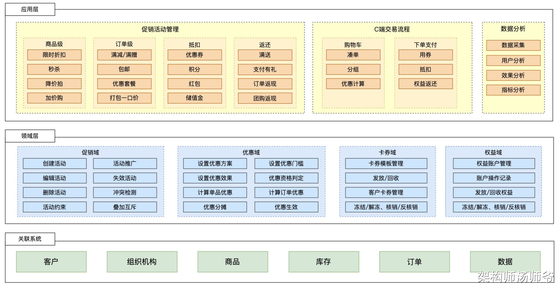 - 优惠域:提供优惠规则设置、优惠门槛判定、各种优惠计算、优惠生效等能力。