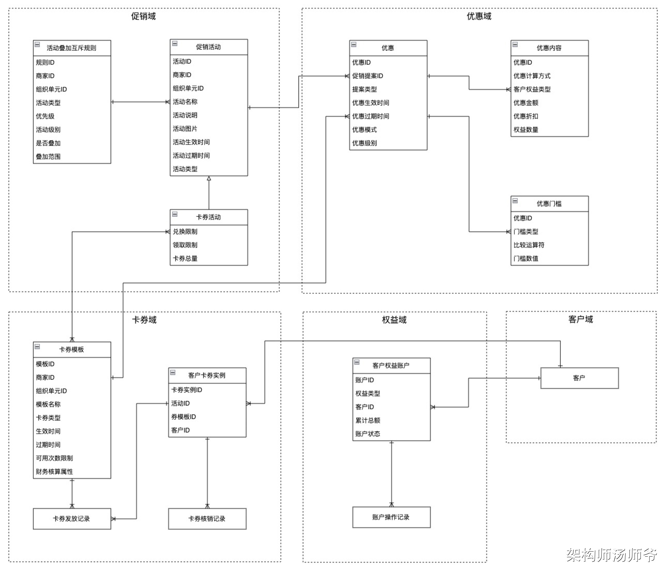 - 卡券域:管理卡券模板,以及卡券实例的生命周期管理,包括发放、核销和过期等。