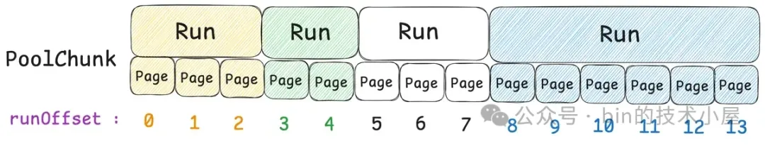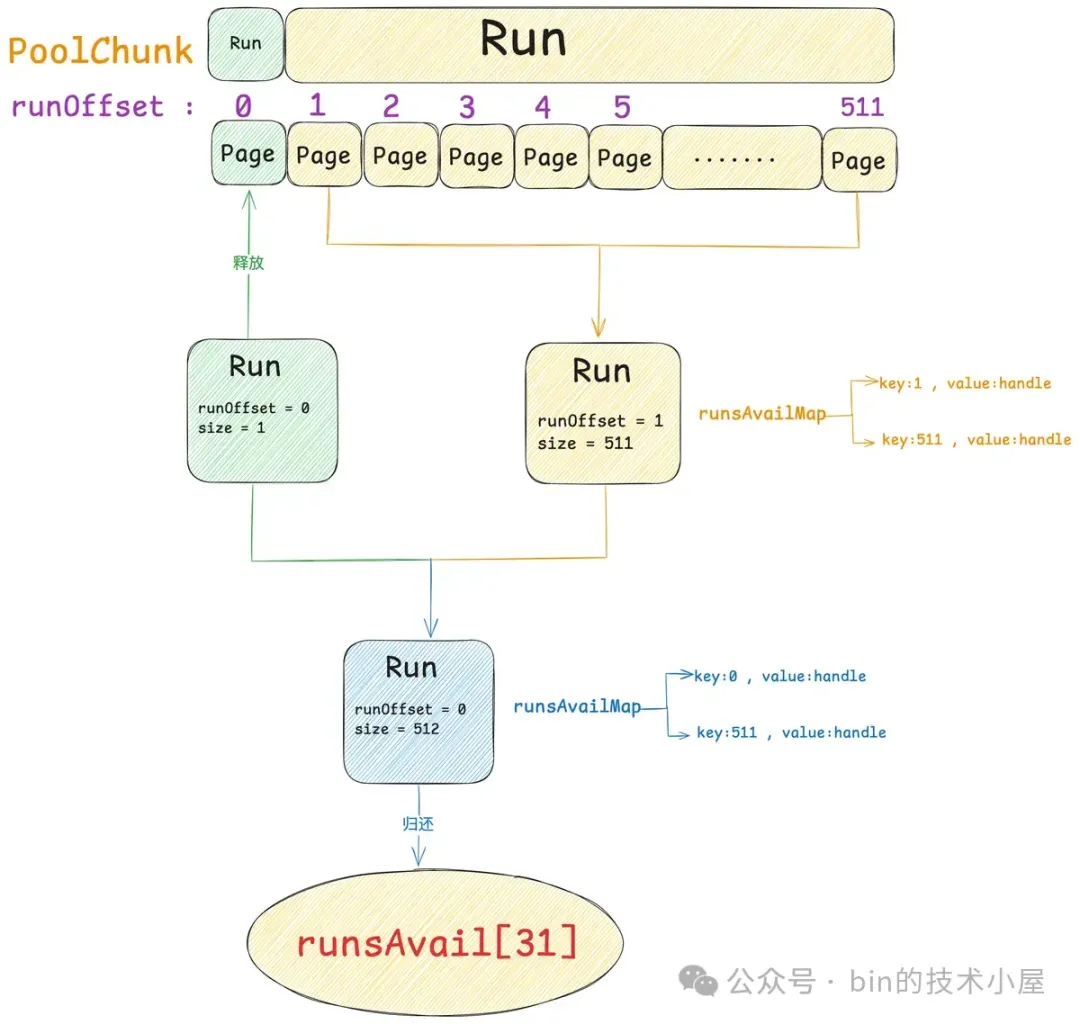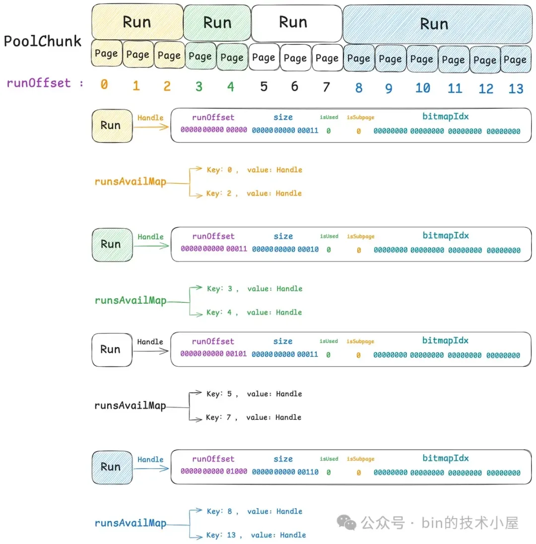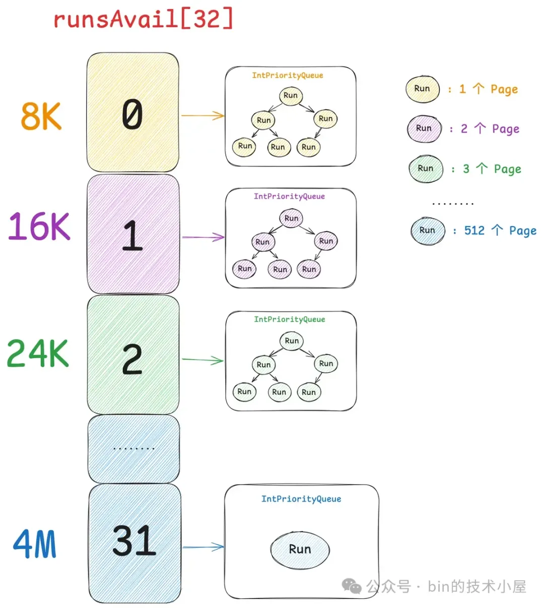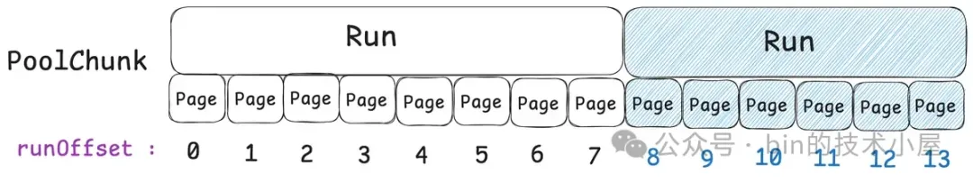 现在我们已经清楚了伙伴系统在 Linux 内核中的实现,那么同样是对 Page 的管理,Netty 中的 PoolChunk 也是一样,它的实现和内核中的伙伴系统非常相似。PoolChunk 也有一个数组 runsAvail。