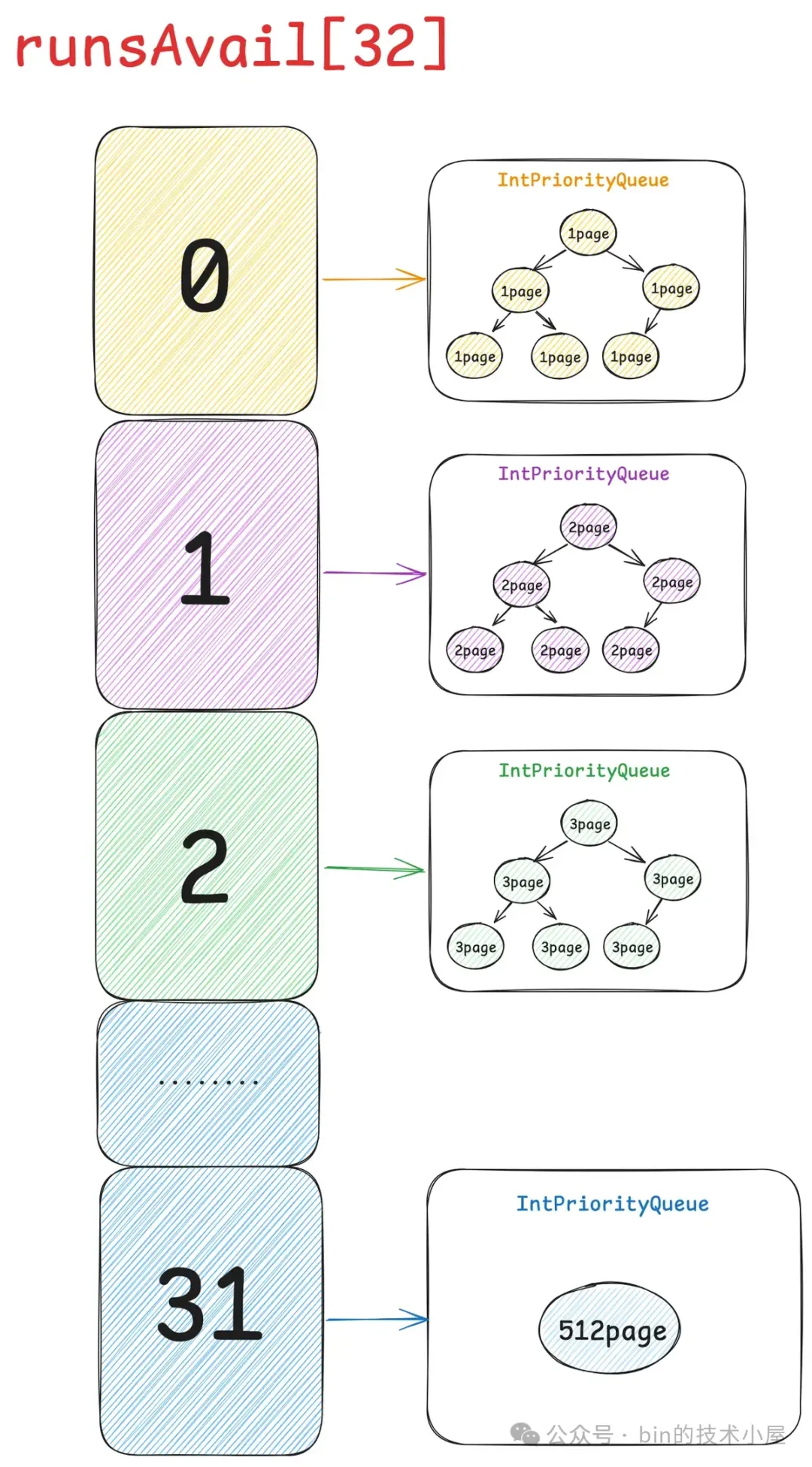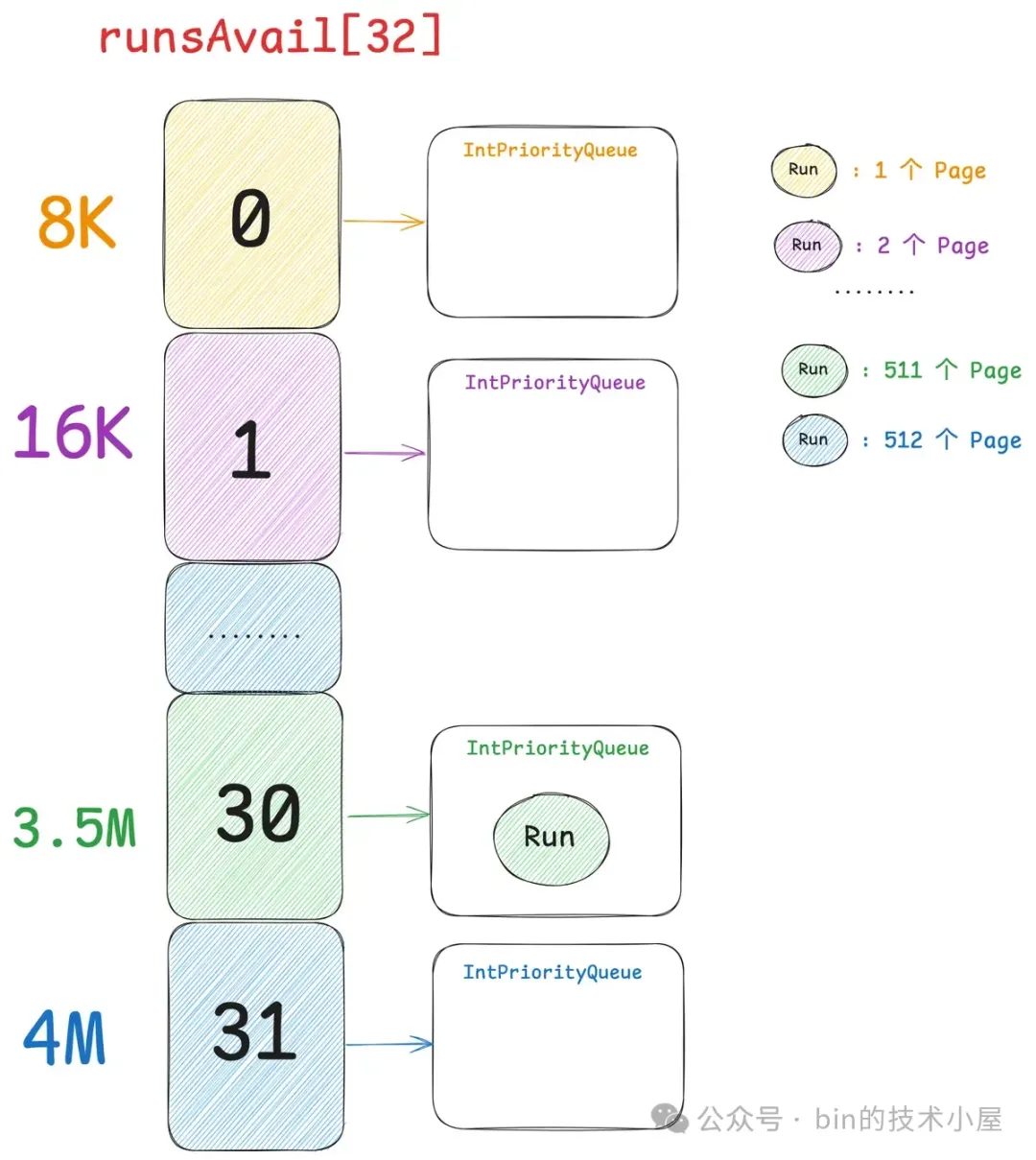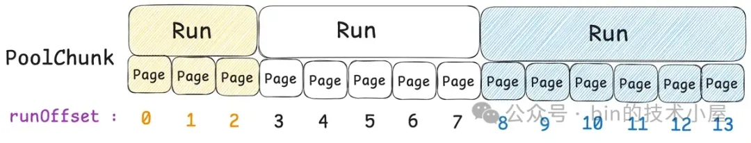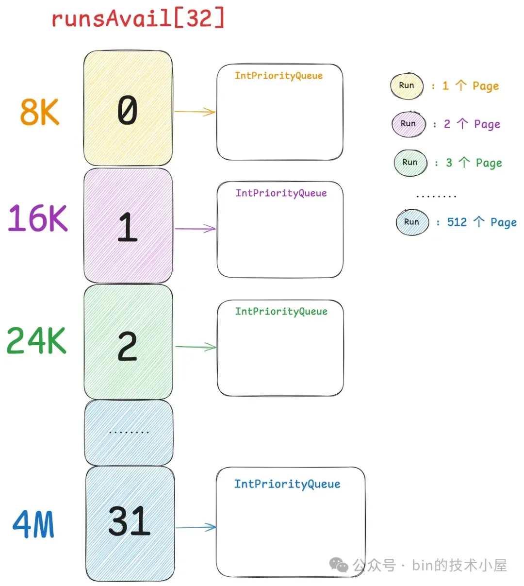 现在我们已经清楚了伙伴系统在 Linux 内核中的实现,那么同样是对 Page 的管理,Netty 中的 PoolChunk 也是一样,它的实现和内核中的伙伴系统非常相似。PoolChunk 也有一个数组 runsAvail。