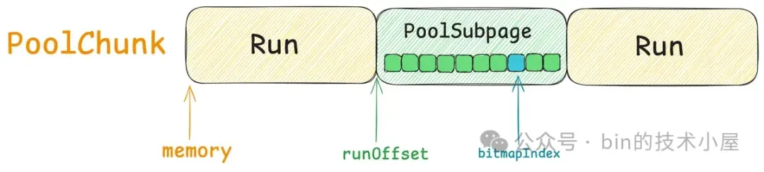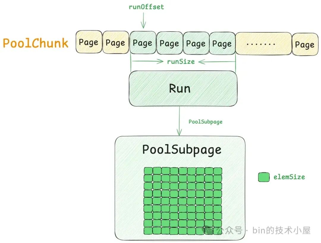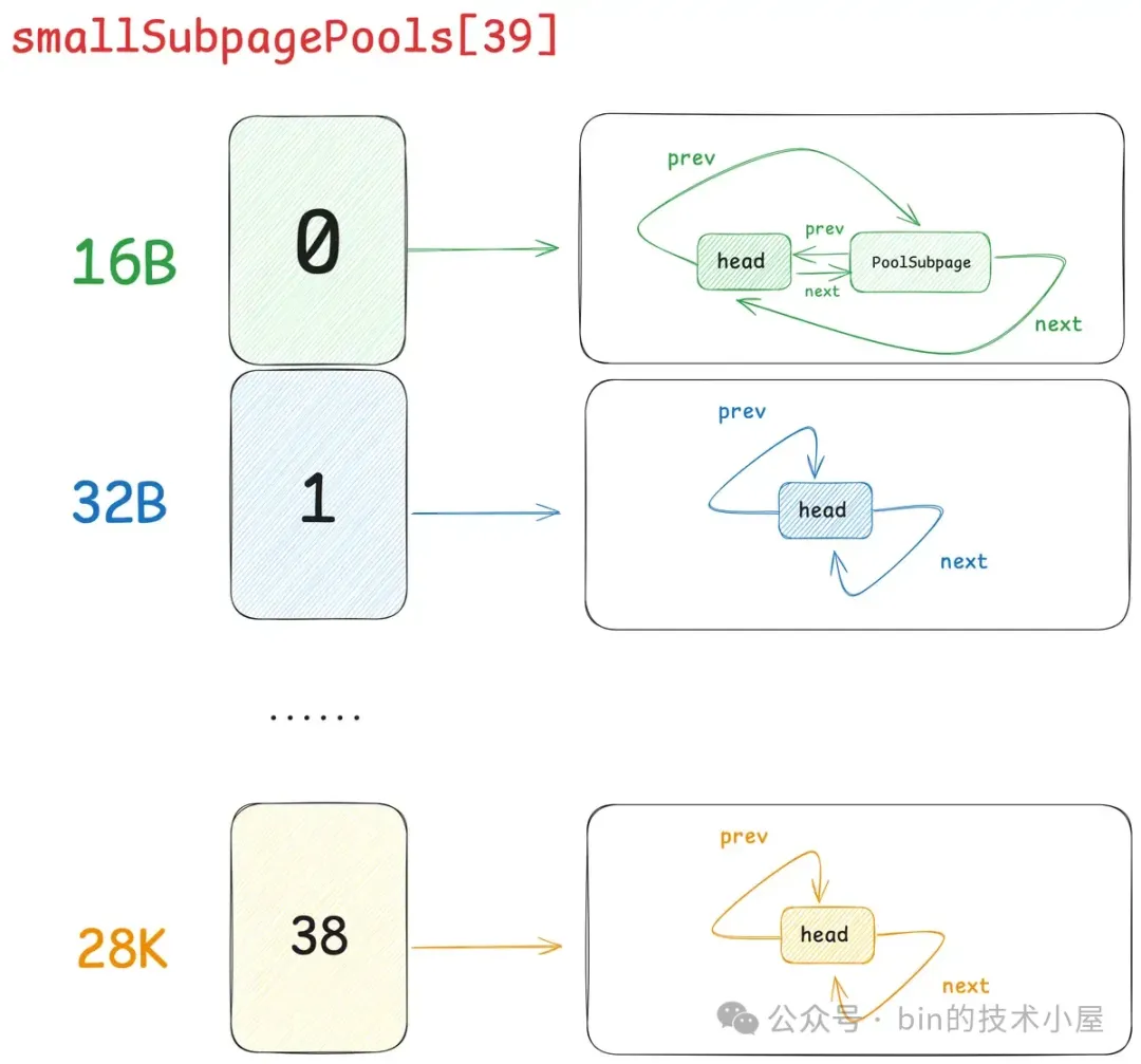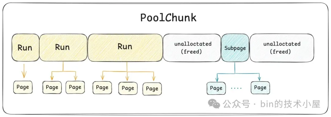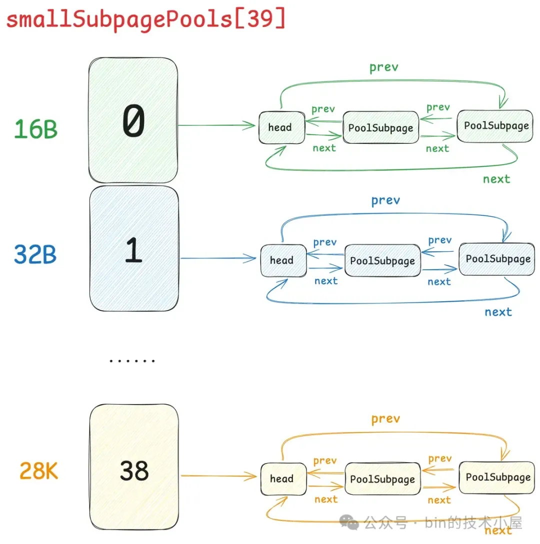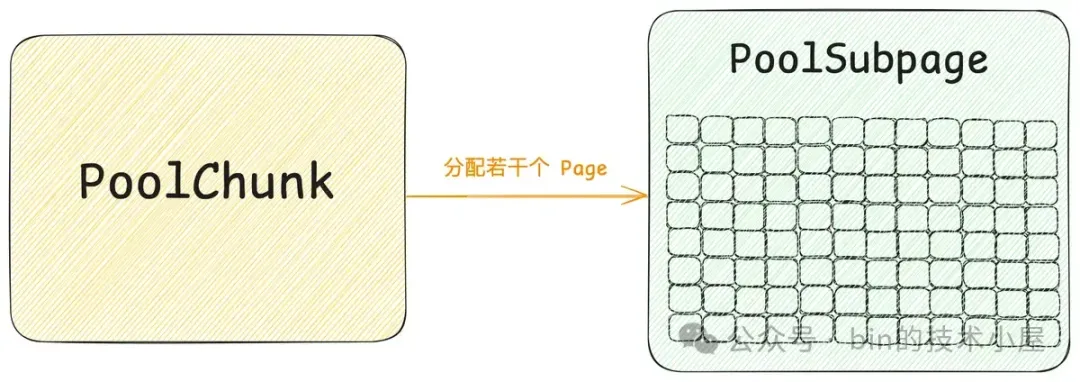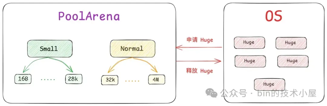 其中 Small 和 Normal 规格的内存块会被内存池(PoolArena)进行池化管理,Huge 规格的内存块不会被内存池管理,当我们向内存池申请 Huge 规格的内存块时,内存池是直接向 OS 申请内存,释放的时候也是直接释放回 OS ,内存池并不会缓存这些 Huge 规格的内存块。