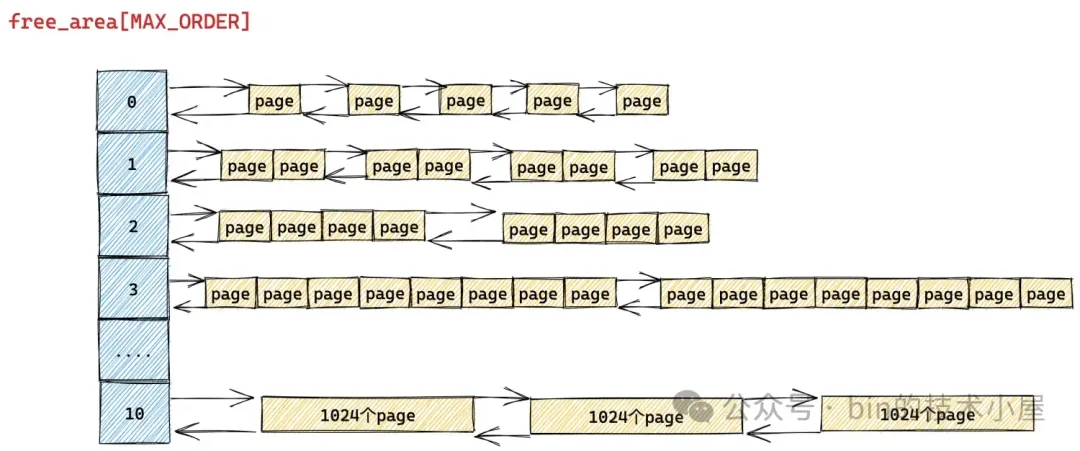 数组 free_area[MAX_ORDER] 中的索引表示的是分配阶 order,这个 order 用于指定对应 free_area 结构中组织管理的内存块包含多少个 page。比如 free_area[0] 中管理的内存块都是一个一个的 Page , free_area[1] 中管理的内存块尺寸是 2 个 Page , free_area[10] 中管理的内存块尺寸为 1024 个 Page。