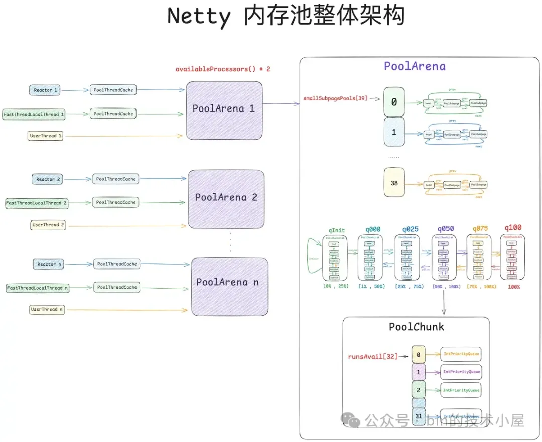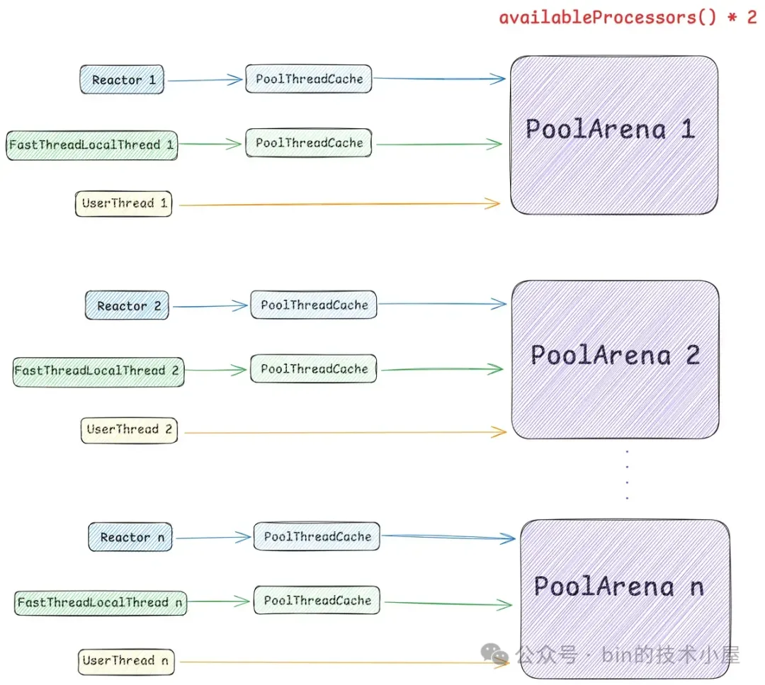 所以线程与 PoolArena 的关系是多对一的关系,也就是说一个线程只能绑定到一个固定的 PoolArena 上,而一个 PoolArena 却可以被多个线程绑定。