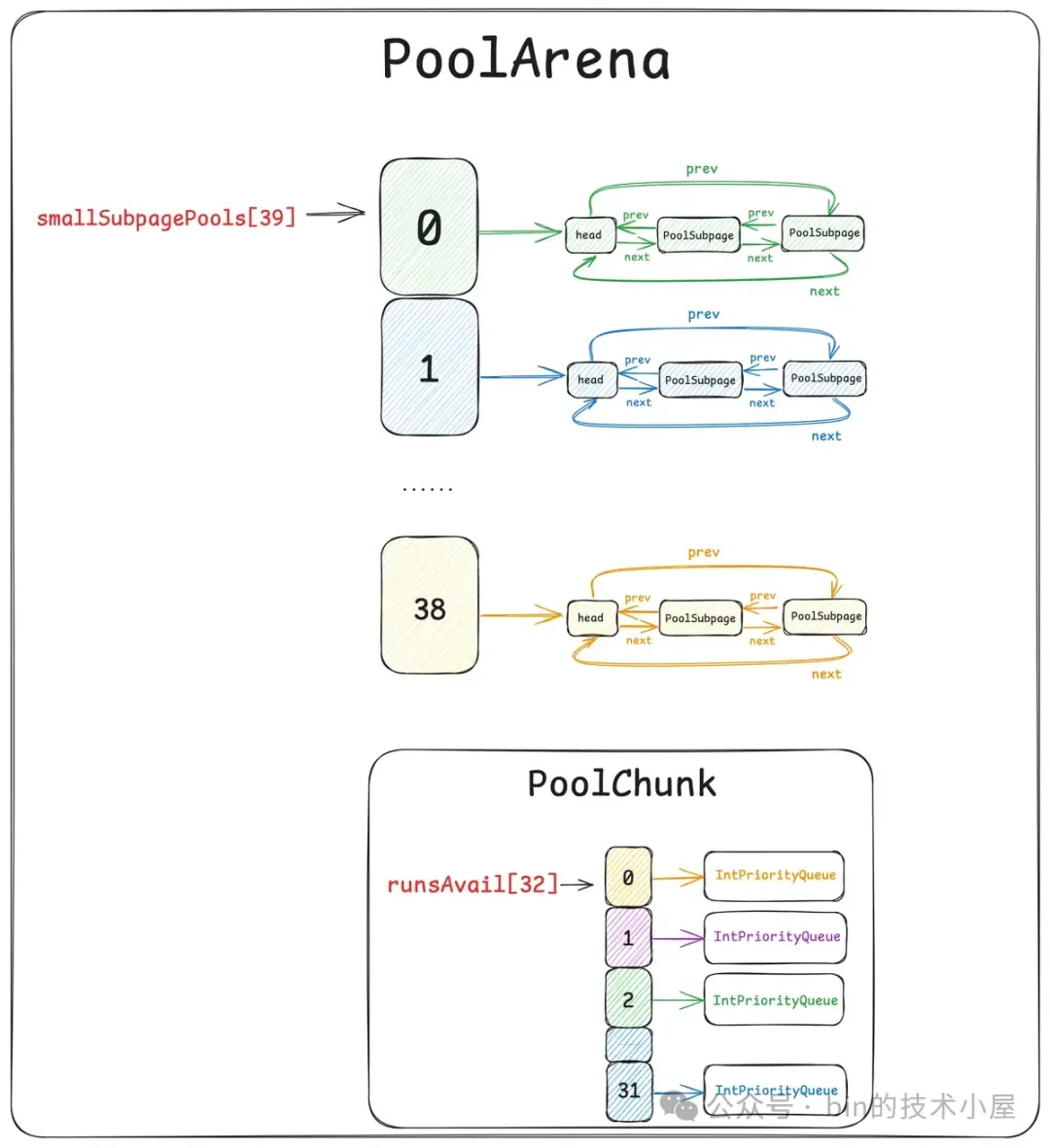 因此在本小节中,笔者的着墨重点是在总体架构设计层面上,先把内存池涉及到的这些众多概念模型为大家梳理清晰,但并不会涉及太复杂的源码实现细节,让大家有一个整体完整的认识。有了这个基础,在本文后续的小节中,我们再来详细讨论源码的实现细节。