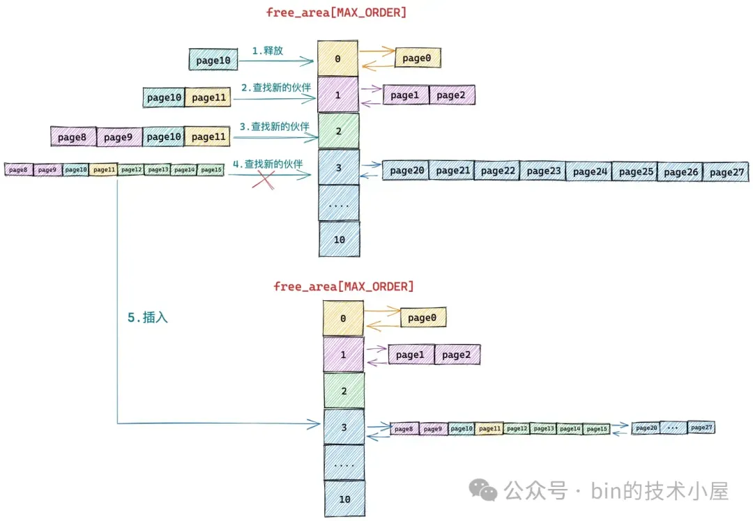 但在 free_area[3] 中的内存块(page20 到 page 27)与新合并的内存块(page8 到 page15)虽然大小相同但是物理上并不连续,所以它们不是伙伴,不能在继续向上合并了。于是内核将 page8 到 pag15 组成的内存块(分配阶 order = 3)插入到 free_area[3] 中,整个伙伴系统回收内存的过程如下如所示: