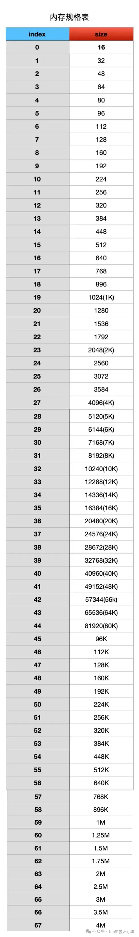 Netty 在向 OS 申请到一个 PoolChunk 的内存空间(4M)之后,会通过 SizeClasses 近一步将这 4M 的内存空间切分成 68 种规格的内存块来进行池化管理。其中最小规格的内存块为 16 字节,最大规格的内存块为 4M 。也就是说,Netty 的内存池只提供如下 68 种内存规格来让用户申请。