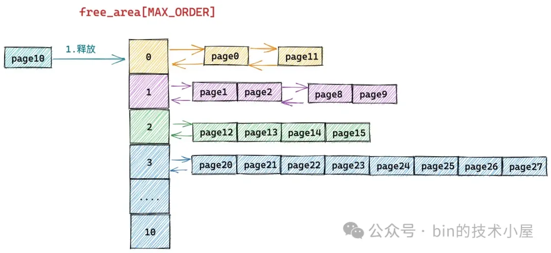 假设我们现在需要将一个编号为 10 的 Page 释放回下图所示的伙伴系统中,连续的编号表示内存地址连续。首先内核会在 free_area[0] 中发现有一个空闲的内存块 page11 与要释放的 page10 连续,于是将两个连续的内存块合并,合并之后的内存块的分配阶 order = 1。