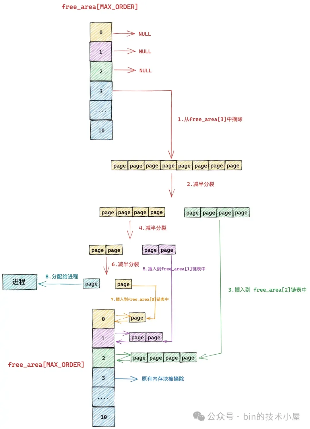 前半部分(图中黄色部分,order = 1)在上图中的第 6 步继续减半分裂,分裂出来的这两个内存块分别包含 1 个 page(分配阶 order = 0),前半部分为青色,后半部分为黄色。后半部分插入到 frea_area[0] 链表中,前半部分返回给进程,以上就是内核中伙伴系统的内存分配过程。