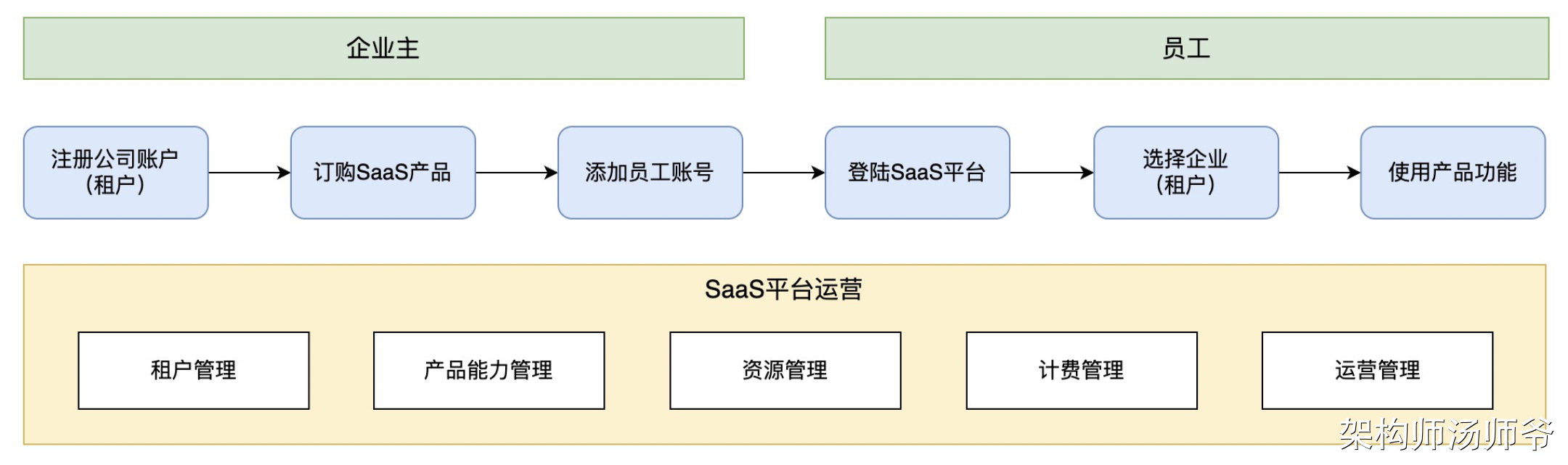 企业主,也就是公司的管理者,他们是SaaS平台的直接客户。企业主想要订购和使用SaaS产品,首先要在SaaS平台上创建一个“企业账号”(也就是租户)。