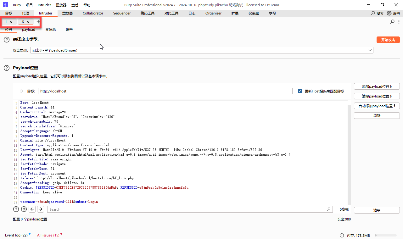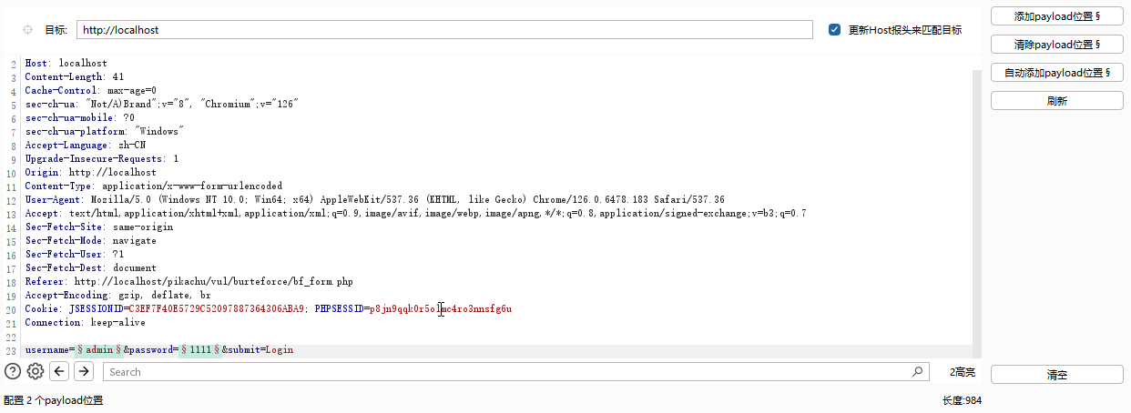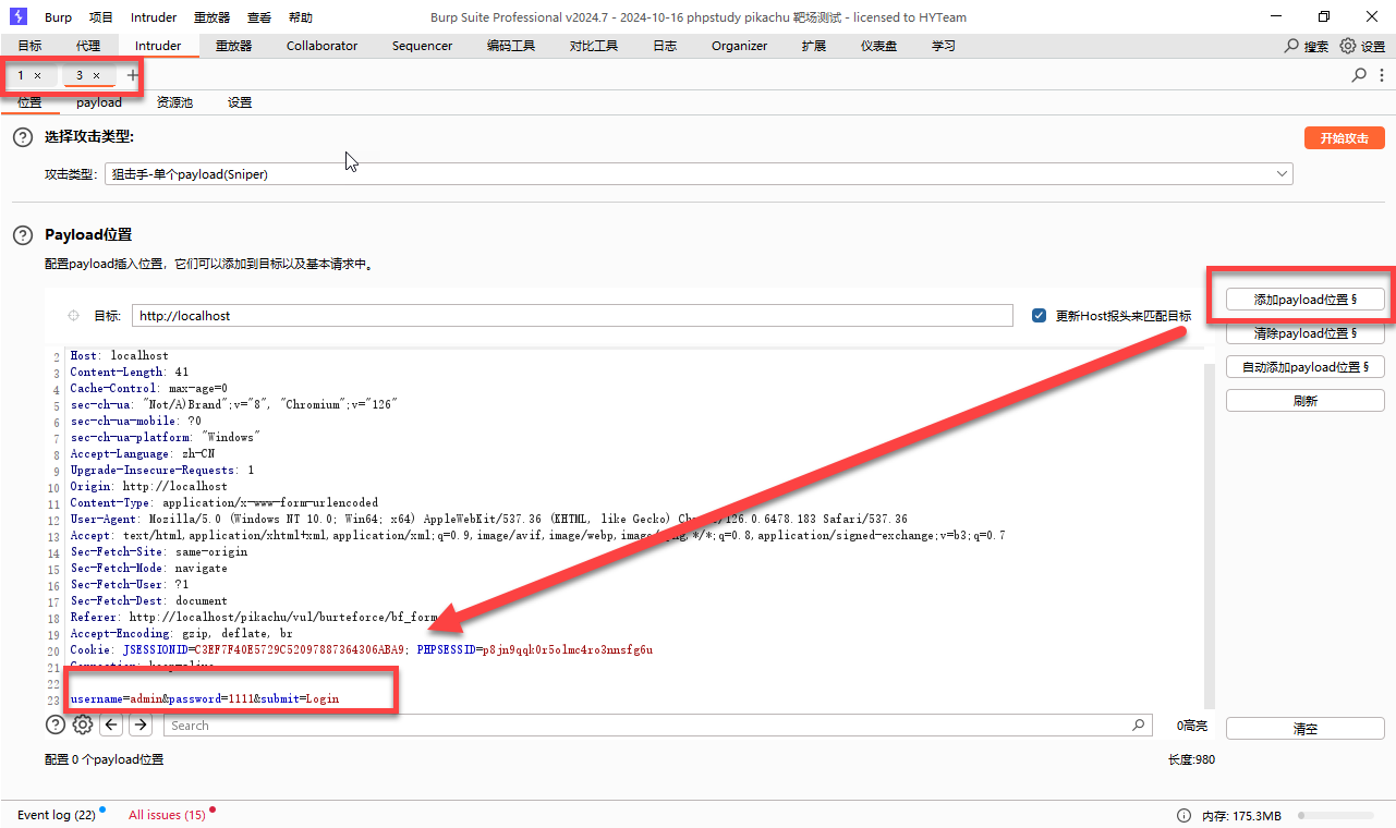 - 点击左侧的 清除payload 的位置按钮 然后选中 用户名 点击 添加payload位置按钮