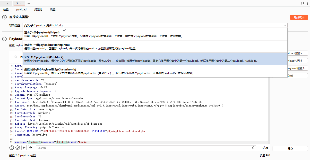 - 点击上方 选择攻击类型按钮 在弹出的下滑菜单中选择 交叉 多个payload集