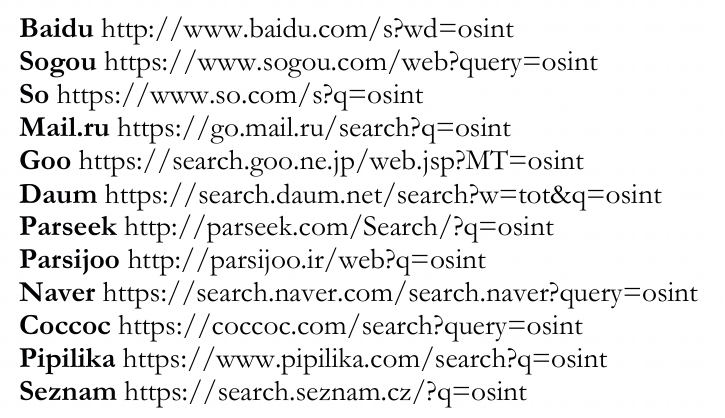 总部设在美国的搜索引擎并非所有国家的主要搜索网站。访问美国以外的搜索网站可以获得不会出现在 Google 或 Bing 上的结果。在俄罗斯,Yandex 是首选搜索引擎。Yandex 提供英文版 yandex.com。这些搜索结果通常与谷歌搜索结果相似,但优先级不同。过去,当谷歌让我失望时,我曾从这个网站上发现了独特的情报。在中国,因为管制不少人人使用百度(虽然整体水平比较糟糕)。在谷歌或必应上看不到的新结果可能很少,但偶尔看看这些网站还是有必要的。主要非主流搜索引擎如下: