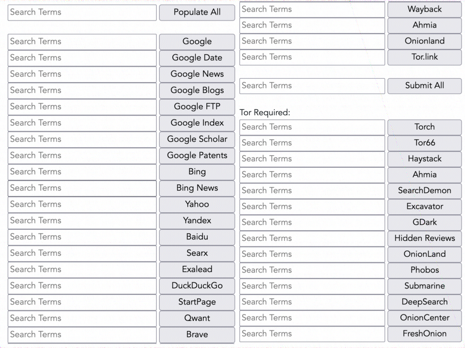 该网站提供一个交互式搜索页面,可将您的查询填充到数百个选项中。在字段中输入搜索词,点击数百个按钮中的任何一个即可开始搜索。许多搜索服务都是针对小众用途的,但你可能会在这里找到本章末尾提供的自定义离线搜索工具中没有的有价值的东西。