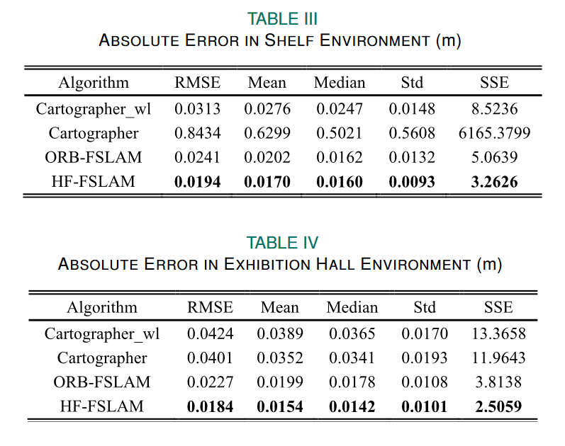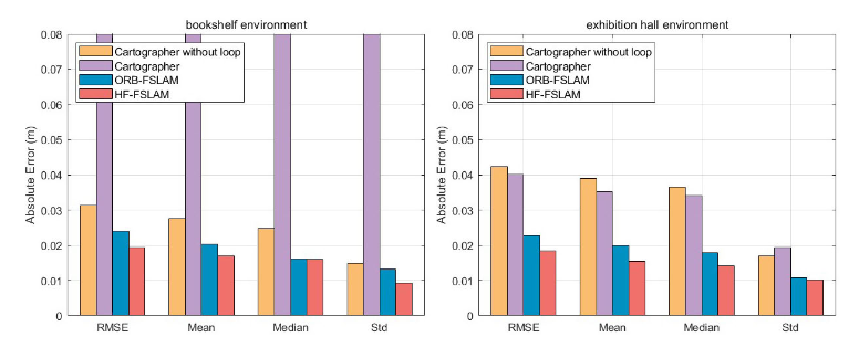 表三和表四显示了绝对位置误差的定量分析结果,cartographer_wl 表示无循环的制图师。无论算法如何,在具有相似几何形状的图书馆环境中,误差通常比在展厅环境中更高,这也意味着具有相似几何形状的场景对于SLAM来说是一个复杂的结构。由于激光传感器的优势,不受环境外观纹理影响较小,这使得系统相比纯视觉SLAM具有更好的鲁棒性。另外,图10给出了定量分析结果的直方图,从中可以看出各组算法的准确率差异比较更直观。在书架环境中,我们的方法显着改进。在霍尔意义上,HF-FSLAM的RMSE分别比cartographer和ORB-FSLAM提高了54.1%和18.9%。因此,本文设计的FSLAM系统与其他系统相比可以显着减小轨迹误差,并且具有更高的定位精度。