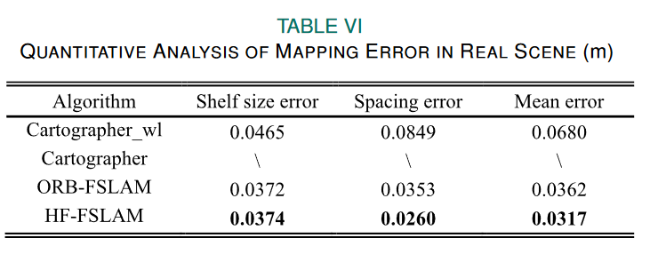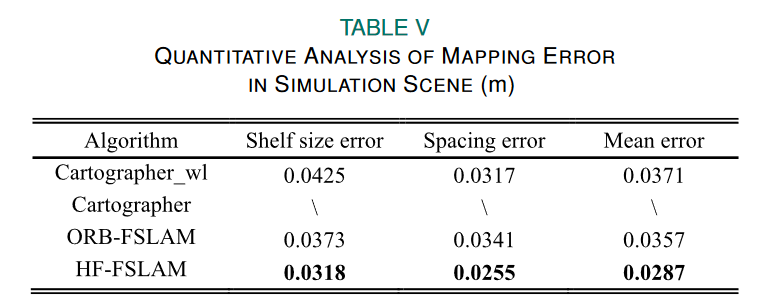 表V和表VI显示了书架环境中的测绘精度评估结果。从数据中从表中可以看出,LiDAR闭环优化算法在这种环境下几乎失败,无法对地图进行定量分析。其他三类无论是否使用闭环优化,每种算法的构建精度都较高,误差在0.05 m以内。由于运动范围较小或用于评估的参考关键位置缺乏测量辨别力,三种算法的误差范围没有显着差异。与表五和表六的数字相比,由于模拟环境中的干扰项较少,因此仿真环境中的结果精度略高于真实环境中的结果。使用循环的系统在构建地图时的错误比不使用循环的系统要少。 HF-FSLAM 的误差最小,这证实了我们方法的优越性。