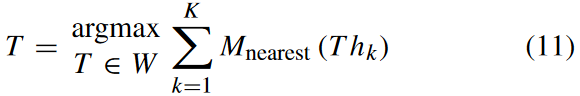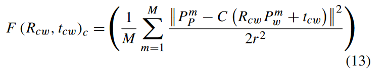 其中 Pp = {Pm P } m=1,…,M 是当前帧中与循环子图中的地图点匹配的特征集,M 是匹配点对的数量,相机内在矩阵为C,r为搜索特征匹配时的搜索半径。 (Rcw,tcw)是从世界坐标系到当前帧相机坐标系的变换。