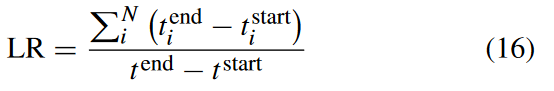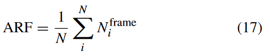 其中N是损失的次数,tstart i和t end i分别是第i次损失的开始和结束时刻,tstart和tend分别是系统运行的开始和结束时刻。重跟踪帧是指跟踪丢失后再次成功跟踪所需的帧数。这反映了跟踪丢失后快速重新启动跟踪的能力。 ARF 的计算方式如 (16) 所示