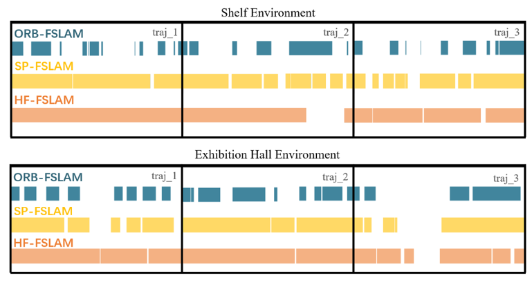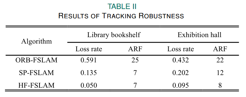 在回环检测的鲁棒性实验中,我们在两个模拟环境中记录了三组运动数据。如图7所示,实色线表示实际跟踪情况,虚线部分为跟踪丢失的位置。两种算法在库仿真环境下的鲁棒性结果如表2所示。无论环境如何,HF-FSLAM的LR都可以保持在0.1以下,并且跟踪连续性比ORB-FSLAM和SP-FSLAM好得多。在重跟踪帧方面,HF-FSLAM和SP-FSLAM的表现比ORB-FSLAM好得多,并且HF-FSLAM的值低于SP-FSLAM,这表明它在丢失跟踪后重新开始跟踪的能力更强。