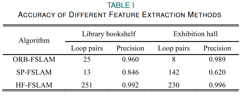 为了测试特征提取算法的性能,我们使用精度来衡量图像检索的准确性。回环准确率也称为检查准确率,准确率越高,检索准确的概率越高,回环检测的准确率越高