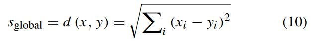我们受 ORB-SLAM [23] 的启发,构建了关键帧之间的共视信息,并且在搜索循环帧时,具有共视关系的关键帧将被排除。考虑到不同场景和算法的实时性,我们使用当前关键帧与回环帧之间的全局描述符的欧氏距离作为匹配分数,而不是验证所有回环帧,计算如下: