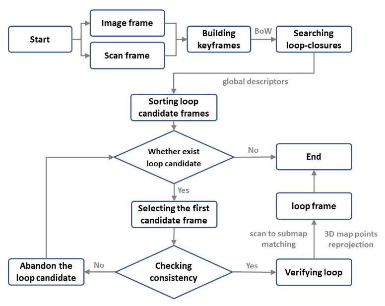 回环检测和校正对于高精度SLAM数据处理至关重要。长期积累的误差可以通过环路检测模块中历史状态的匹配来修正。与激光雷达信息相比,视觉数据可以获得更多的结构、纹理等环境信息,因此更有利于回环检测。