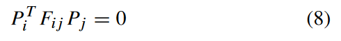 其中 Fi j 是两帧的基本矩阵,Pi = (ui , vi ) 和 Pj = (u j , v j ) 分别是 fi c 和 f j c 的匹配特征。然而,由于存在误差,该点并不处于理论位置,因此我们检查极线的距离是否低于阈值极线,以明确接受图像对。