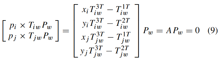 其中 Pw = (X, Y, Z , 1) 是 P 在世界坐标系中的 3-D 坐标,pi = (xi /zi , yi /zi , 1) 且 p j = (x j /z j , y j /z j , 1) 分别是对应图像帧 f i c 和 f j c 的相机归一化坐标。 f i c 和 f j c 从相机坐标系到世界坐标系的变换分别表示为 Tiw = (Riw, tiw) 和 Tjw = (R jw, t jw )。 T kT iw 表示 Tiw 的第 k 列。通过奇异值分解(SVD)解决问题,我们可以得到Pw。我们将检查结果并通过卡方检验去除异常值。当地图点投影到图像f i c 和f j c 的重投影误差均小于阈值时,3维地图点被接受;否则,它将被丢弃。