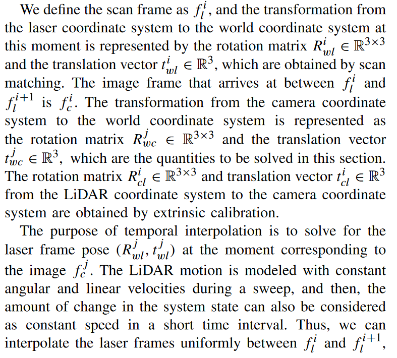 我们定义扫描坐标系为 fi l ,此时激光坐标系到世界坐标系的变换用扫描得到的旋转矩阵 Ri wl ∈ R3×3 和平移向量 ti wl ∈ R3 来表示匹配。在 fi l 和 fi+1 l 之间到达的图像帧是 f i c 。从相机坐标系到世界坐标系的变换表示为旋转矩阵R j wc ∈ R3×3和平移向量tj wc ∈ R3,这是本节要求解的量。通过外参标定得到从LiDAR坐标系到相机坐标系的旋转矩阵Ri cl ∈ R3×3和平移向量ti cl ∈ R3。