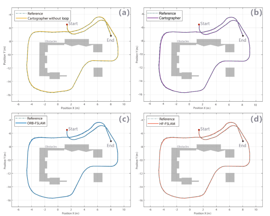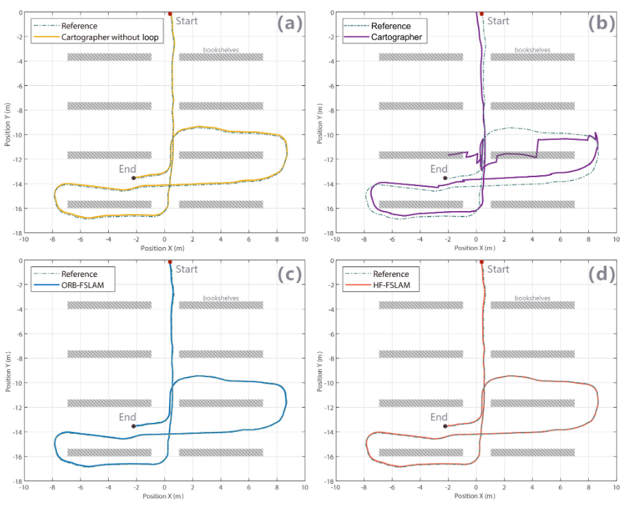 为了论证算法在实际中的可行性,我们还将本文设计的算法放在具有上述设备的真实环境中,四种轨迹如图11所示。在展厅环境中,轨迹基本相似因为结构明显,特征点较多。在图书馆环境下,实验结果与我们的预期一致。带循环的纯 LiDAR 算法由于结构相似而导致错误的循环,因此产生最差的轨迹。 Cartographer在x坐标上明显短于其他轨迹,证明LiDAR里程计受到环境干扰。由于误差的累积,越接近终点,无环路制图师的轨迹漂移越大。相比之下,ORB-FSLAM和HF-SLAM的轨迹保持在更好的水平。
