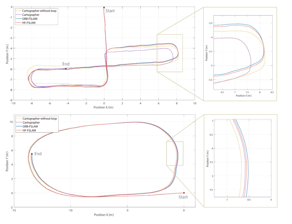 图 9 显示机器人的运动形成了一个循环。对比子图,无论是使用扫描闭环的制图师还是本文提出的使用融合闭环的FSLAM系统,其误差都比不使用闭环的制图师系统要小,这也体现了闭环优化的作用是有用的。
