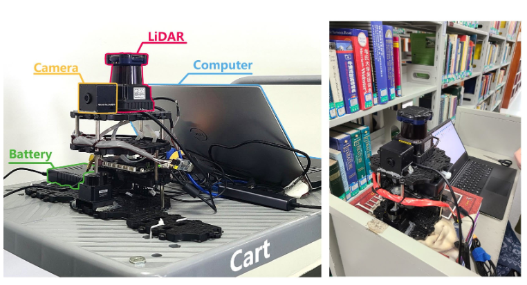 实验设备如图5所示。模拟采用Inter Core i7-1075H CPU、16GB RAM、Nvidia GeForce RTX2060 GPU;以韩国ROBOTIS公司生产的turtlebot3机器人为框架,顶部放置Hokuyo 2-D LiDAR,附近放置单目相机,并对LiDAR进行标定摄像头是通过Autoware软件执行的。机器人的运动系统被拆除,整个机器人被绑在图书推车上。上位机的Raspberry Pi控制板更换为PC。激光雷达的帧率为10Hz,照片分辨率为680×480,频率为20Hz。该分辨率能够在有效提取特征的同时,还能保证计算量不会太大。相机通过USB与电脑连接,激光雷达通过网线连接,保证数据传输的低延迟。对获取的数据进行后处理,后处理所用的实验配置与仿真实验一致。