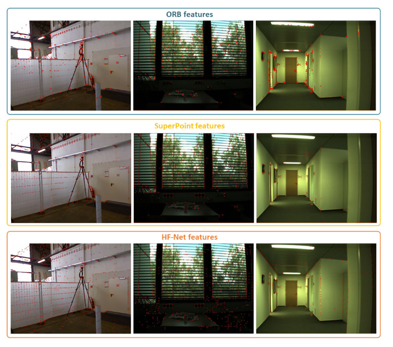 为了处理这个任务,我们构建了一个图像测试数据集。数据来自多个公共数据集[38]、[39]、[40]、[41],仅保留公共数据集中的室内场景图像。我们对 ORB、SuperPoint 和 HF-Net 的提取效果进行了定性实验分析。两种算法提取的特征数量最大均为1000,实验结果如图6所示。选取测试集中的三幅代表性图像作为例子,展示各种算法的特征点提取效果。第一列是低纹理区域,ORB特征提取器在白墙上获得的特征点较少,而深度特征提取器几乎恢复了墙壁上的纹理;第二列是昏暗的环境,如图像的下半部分所示,ORB提取的特征点较少,而深度特征提取器在此环境下仍然可以提取更多的特征点;图像的第三列是低纹理的长走廊环境,HF-Net 可以比其他方法提取更多结构化特征点。可以验证,深层特征比ORB特征可以应用在更多的环境中,受光照影响更小,即使在缺乏视觉纹理的环境中也能具有良好的特征点检测能力。