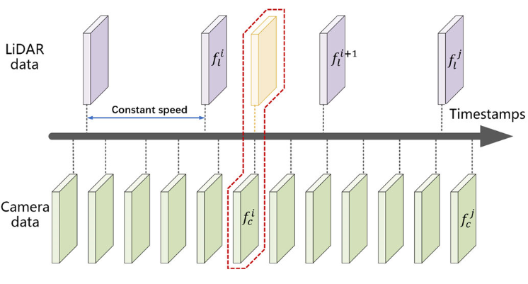采用时间校准和插值来解决不同采集频率的传感器问题。如图2所示,由于采样频率不同,在获取视觉帧时,对应的时间戳下可能不存在激光帧。因此,坐标两个数据不能直接转换。在本文中,我们对激光帧的数量进行插值以适应视觉框架,并且仅将激光帧姿势进行变换以与视觉框架同步,以减少计算量。
