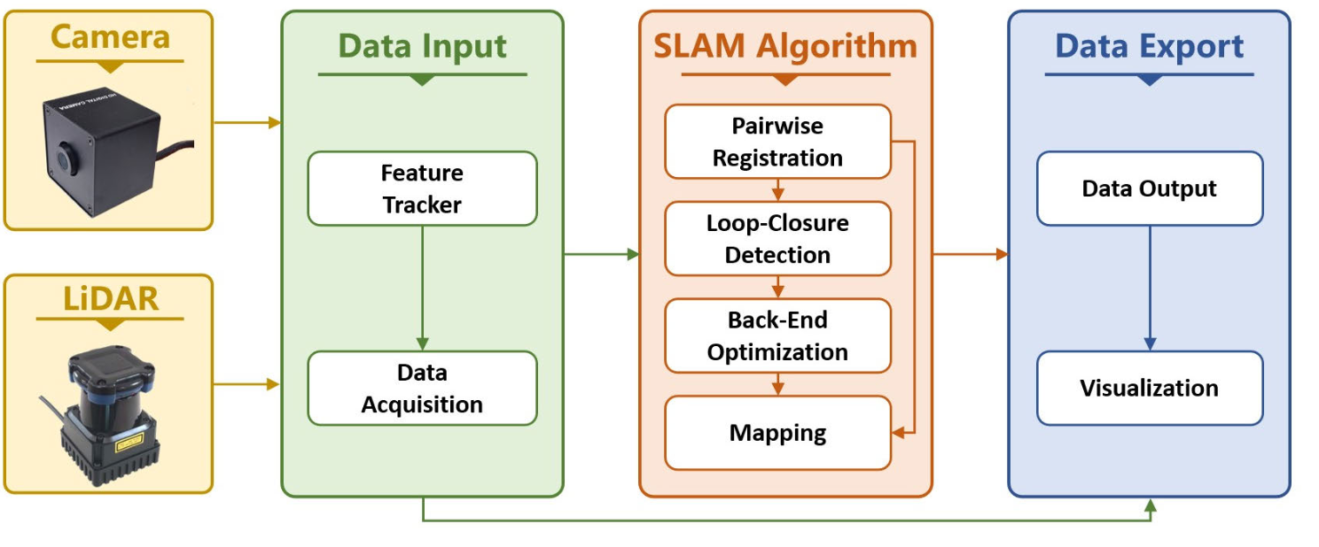 整体系统结构如图1所示。本文的SLAM框架以二维激光雷达为核心用于定位和绘图的传感器。由于单目运动估计的精度和鲁棒性较低,因此仅用于回环检测。该系统是基于cartographer [6]、[8]、[33]构建的,这是经典的2-D LiDAR SLAM算法。所提出的闭环算法使用 HF-Net,取代了原来的算法并保持了与之前系统的兼容性。此外,完整的SLAM系统包括数据输入模块、定位与建图模块、数据输出与可视化模块。