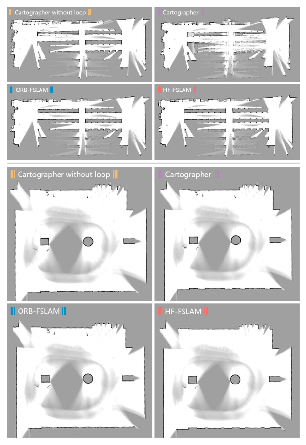 真实环境的映射结果如图13所示,与虚拟环境中的性能一致。在真实的书架环境中,HF-FSLAM 是性能最好的系统。不带循环的cartographer构建的地图存在明显的累积误差,在这种环境下cartographer无法正常工作。在真实的大厅环境中,由于场地面积较小且结构明显,四种SLAM方法的地图精度相差不大。