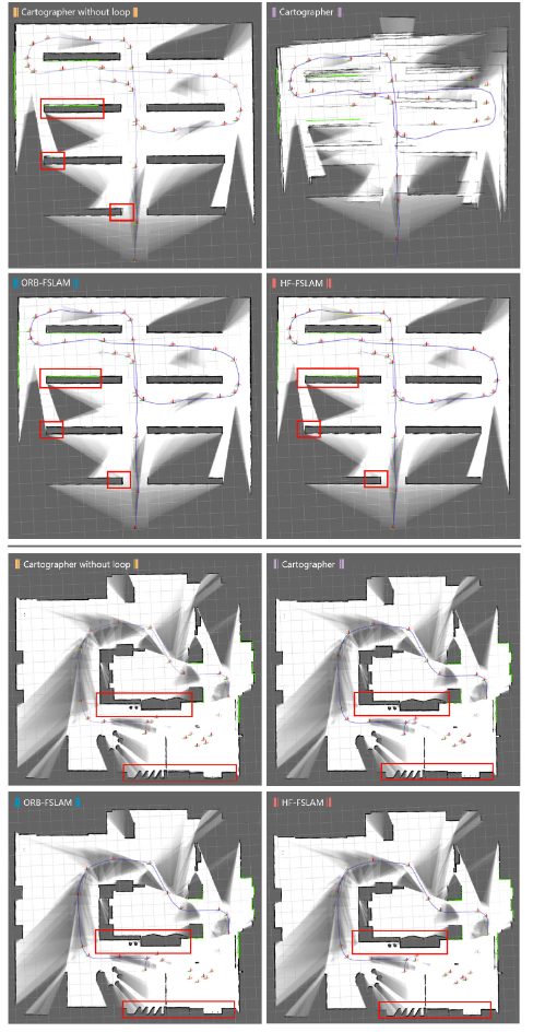 图13中的第三张图是ORB-FSLAM结果,第四张是本文提出的HF-FSLAM系统。两种方法的建图精度均明显优于同一区域内无环路SLAM,证明系统成功优化了地图。仔细观察映射结果后,我们发现HF-FSLAM的书架边缘比ORB-FSLAM更少模糊,这证明了深度特征提取算法的优势。对于书架场景,在红框标注的区域,还可以看出,有环路闭合的算法的准确性比没有环路的算法要好。 FSLAM的结果比无循环的算法边缘更清晰,建图效果更好,这也验证了闭环模块对建图的影响。