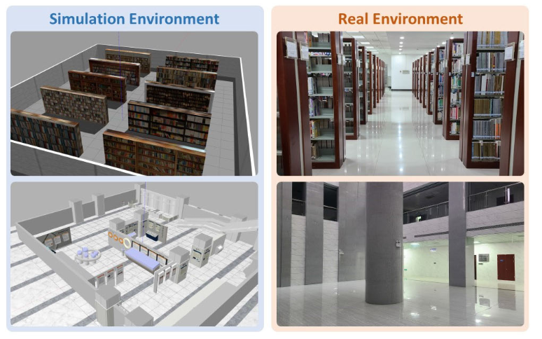 我们在两个区域进行实验:展厅和图书馆书架。考虑到轨迹绝对误差的评估以及实验的方便性,在现场实验之前,我们在ROS Melodic操作系统下搭建了基于Gazebo 9的仿真环境。我们记录运动的真实轨迹,以比较模拟环境中算法的准确性,并比较真实场景中实际轨迹与构建地图的可靠性。仿真场景和真实场景如图4所示。