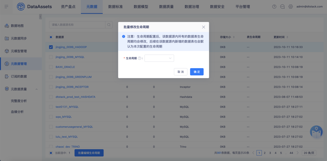 为了改善这一状况,新功能在元数据管理页面上做出调整,将展示的维度修改为“数据源–数据库–数据表”。支持基于数据源、数据库、数据表维度进行生命周期的批量配置,提高了操作的便捷性和管理效率。