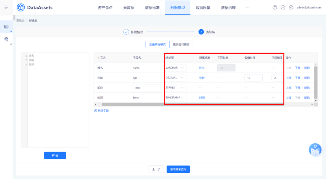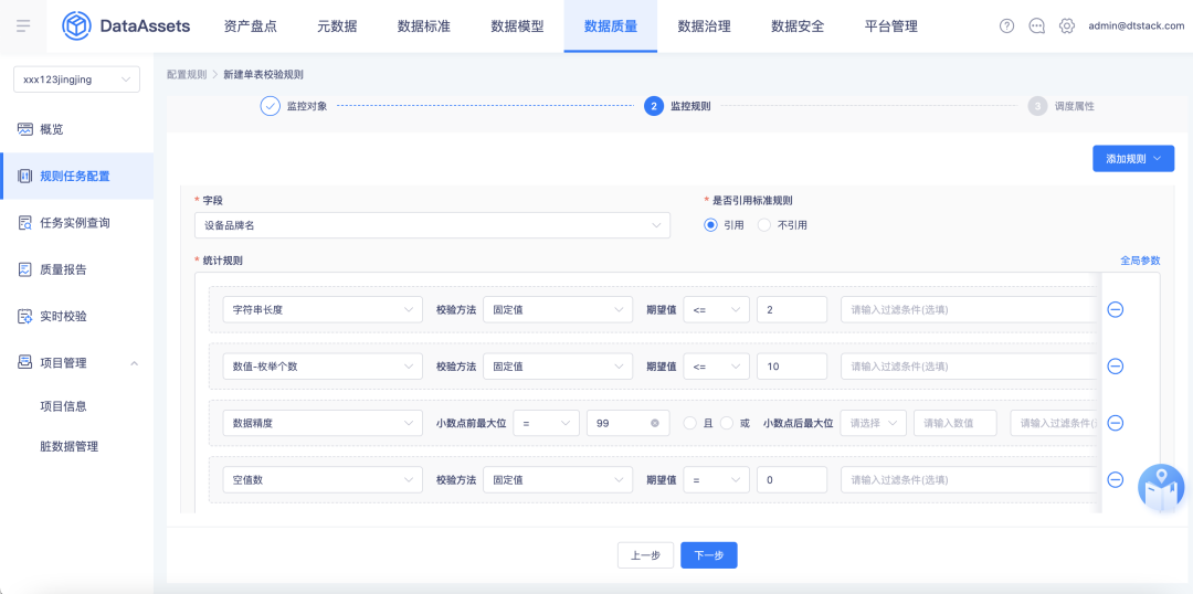 如果用户选择引用标准规则,平台则会根据标准中定义的长度、精度、枚举个数、是否空值、是否重复,自动生成质量校验规则。