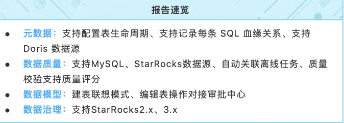针对 Doris2.x 类型数据源支持元数据采集、血缘分析、数据治理(不包括小文件治理)、数据质量(所有功能均支持)、数据脱敏、数据权限(行列级权限);