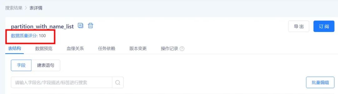 (1)「数据地图」-「表详情」页面支持在数据表名下方展示表质量评分(若该表无质量评分则不展示),支持点击数据质量评分后跳转至:数据质量>质量报告> 该数据表的质量报告,提供更详细的数据质量信息。