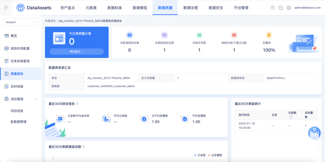 新增支持针对单表校验的表级质量报告分析,内容包含表质量评分、质量分值变化趋势、质量评估概览、近期规则校验异常明细、近期校验结果。