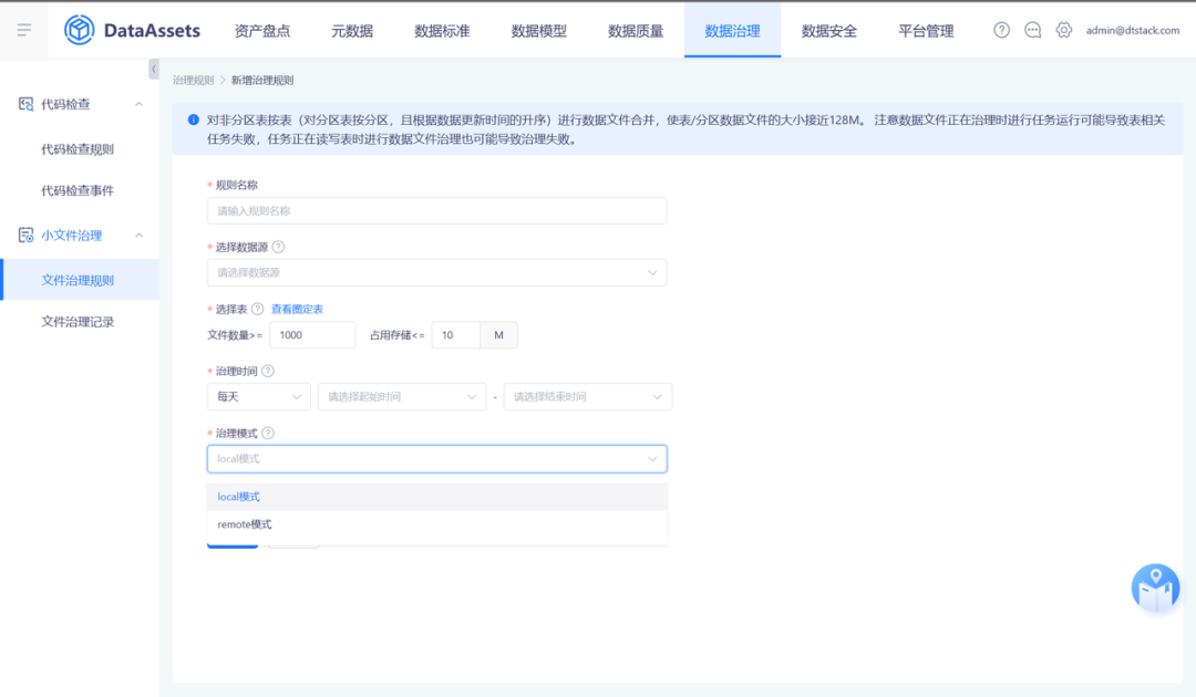 在进行周期治理/单次治理时,支持选择 Local 模式/Remote 模式;