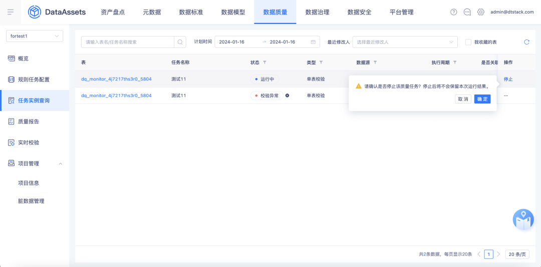 (2)支持中途停止质量任务:质量规则创建后,支持在质量任务运行过程中进行中途停止操作。有助于及时释放被占用的资源,避免不必要的等待时间,提供更加灵活和高效的服务。