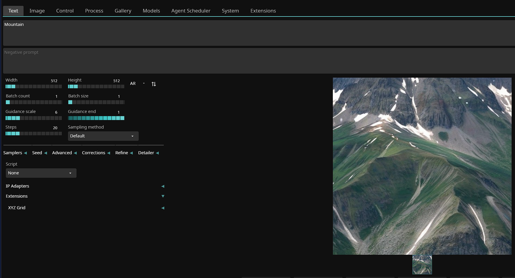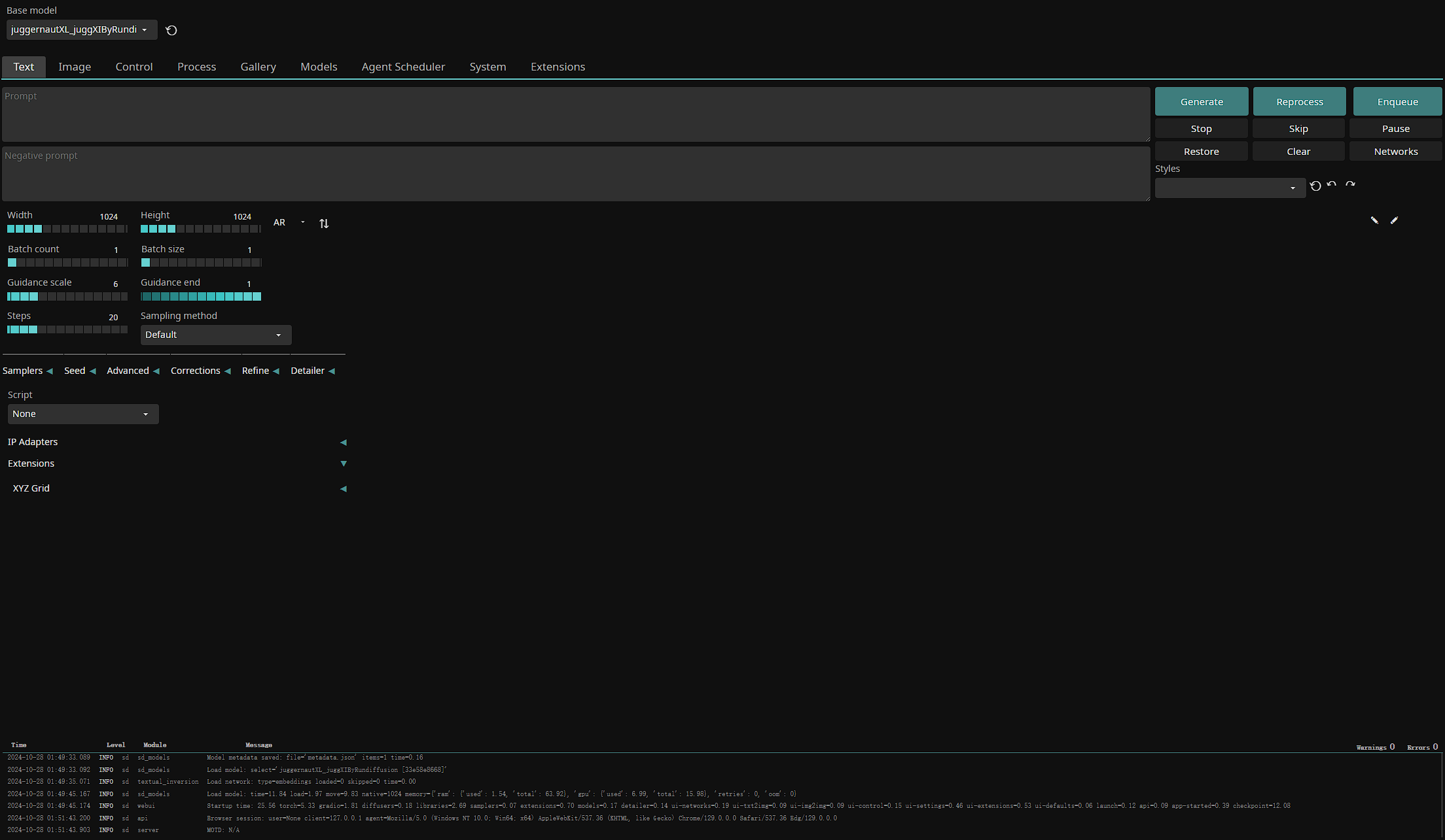 另外,webui 推荐 SD.NEXT automatic,这个版本对 AMD 显卡支持更好,我最后是用这个版本跑起来的。运行 webui.bat,默认启动在 7860 端口,第一次启动要编译十几二十分钟,耐心等待,界面如下图:
