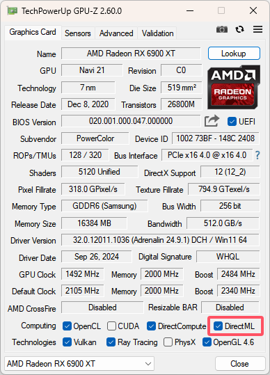 下图是 GPU-Z 的截图,可以看到显卡对 DirectML 以及 CUDA 的支持情况,虽然本文一直说的是 AMD 显卡,但实际上 Intel 的显卡也有一部分支持 DirectML,理论上也是可以使用这个方案的,不过案例较少,没有了解,这里不详细说明了。