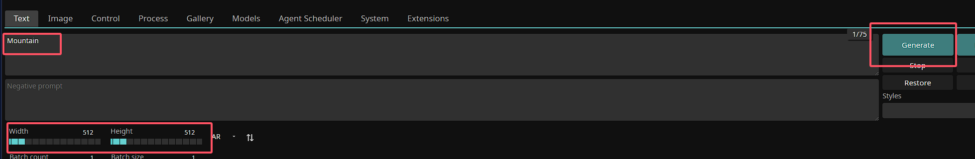 我之前已经挂载过模型了,如果第一次进入可能会让你选择一个模型。加个提示词随便输出一张,尺寸最好不要太大,512×512 就行,原因会在另一篇专门讲生成的文章里说: